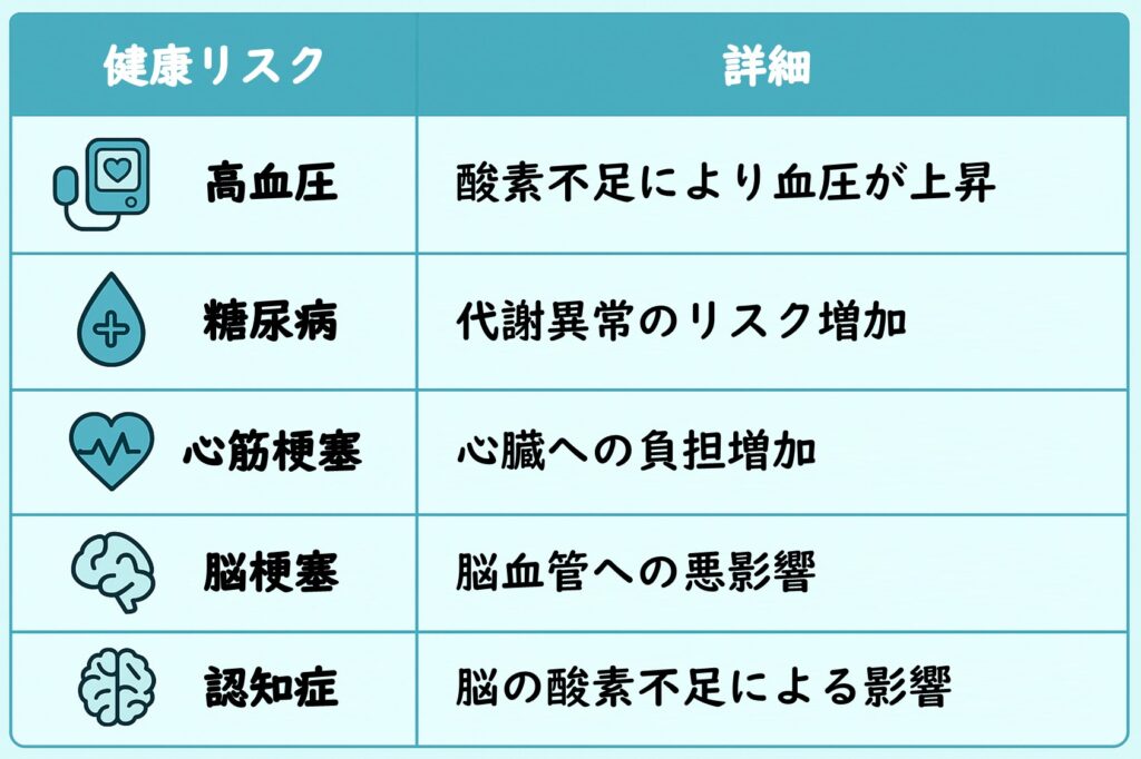 SASは血液中の酸素濃度が下がってしまう病気(睡眠中に気道が閉塞し、無呼吸・低呼吸が繰り返されることで、血中酸素が低下し、睡眠が分断される疾患)です。これにより、以下のような健康リスクが高まります。
